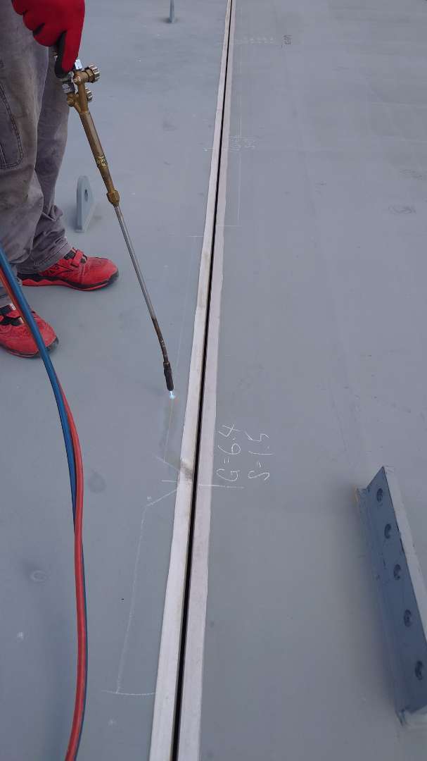 本日は 溶接を行う前段階の鋼床板と鋼床板の段差を無くす 目違調整を行っております。