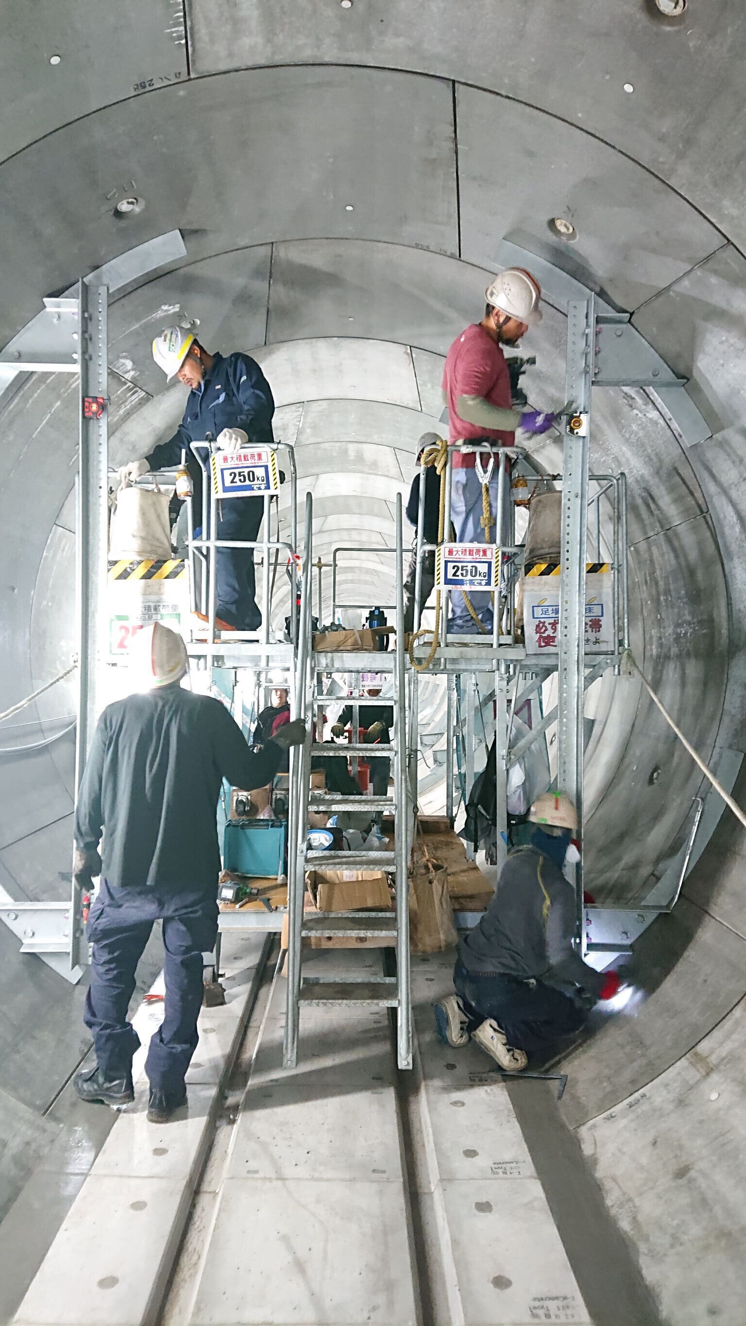 できあがったトンネルに金物を設置いたします。ラックなど用途ごとの施工・設置が可能です。